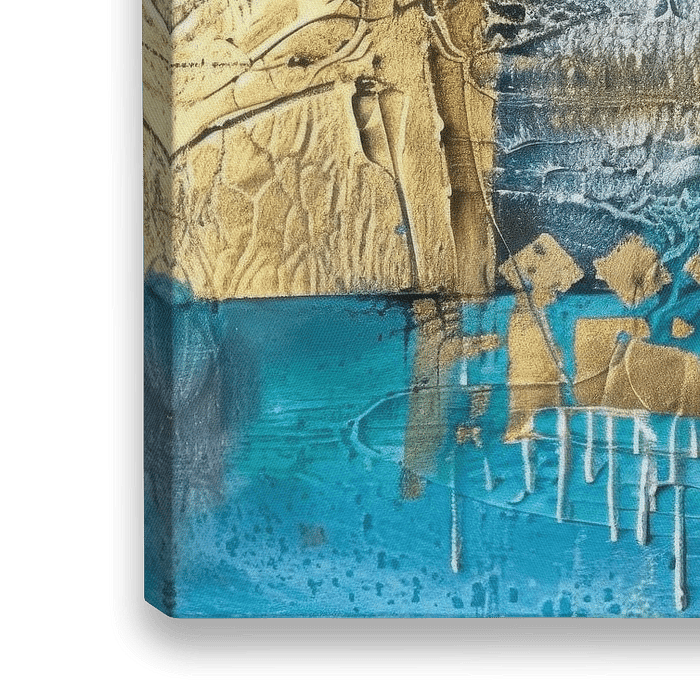 Bestelle dieses abstrakte Wandbild Abstrakte Malerei in Türkis und Gold von Joriali Abstrakte Kunst als Reproduktion auf Leinwand, Alu-Dibond, als Poster, Fototapete oder Acrylglasbild.