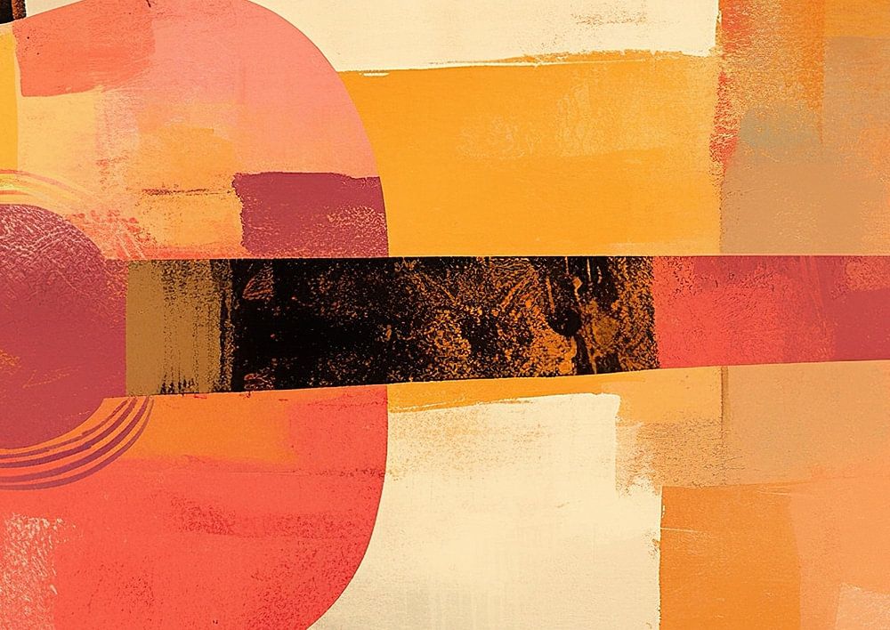 Abstraktes Gemälde mit Gitarre - Dieses abstrakte Gemälde zeigt eine Gitarre, die sich durch ihre schönen Formen und warmen Farben auszeichnet, mit einem Hintergrund aus hellen und leuchtenden Farbtönen, die zusammen eine fröhliche Atmosphäre schaffen.