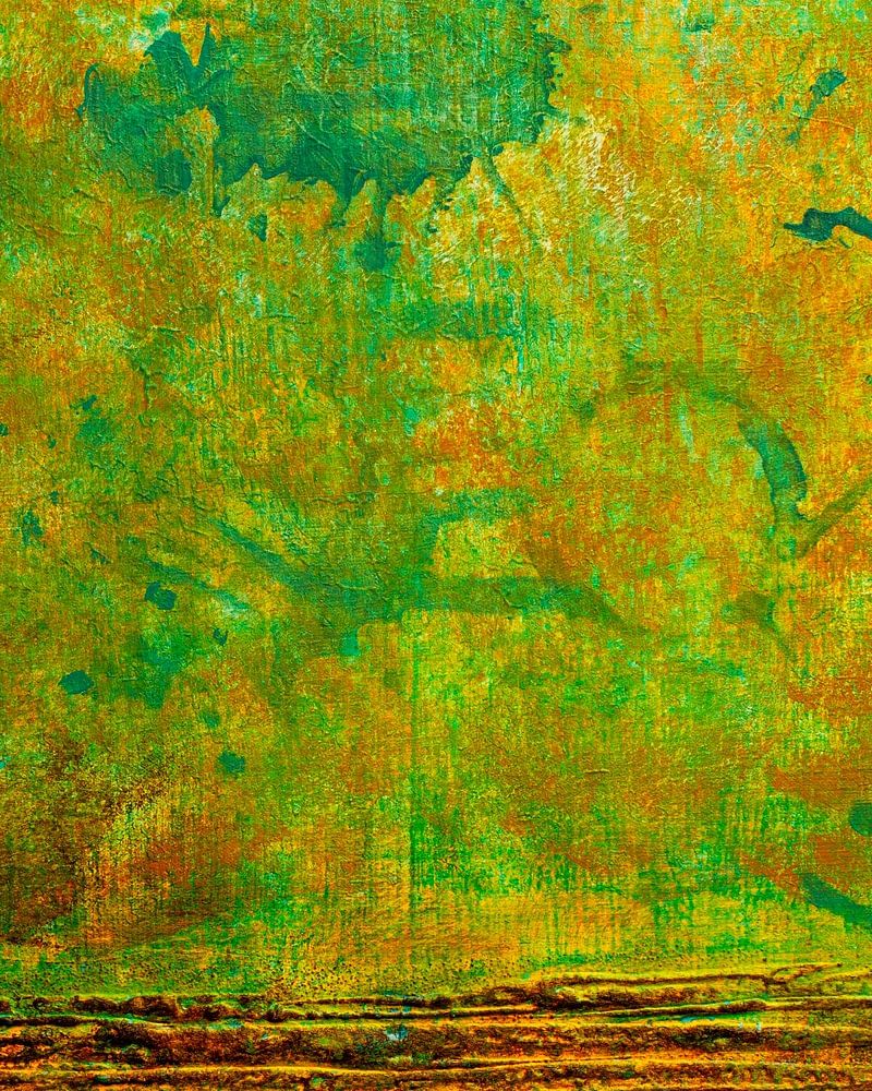 Abstraktes Gemälde mit einer überwiegend grünen und gelben Farbpalette. Die Oberfläche des Gemäldes hat eine Textur aus verwittertem Metall und oxidiertem Kupfer, mit einer Mischung aus Grün-, Gelb- und Brauntönen. Die groben, horizontalen Linien erzeugen ein Gefühl von Bewegung und Textur.