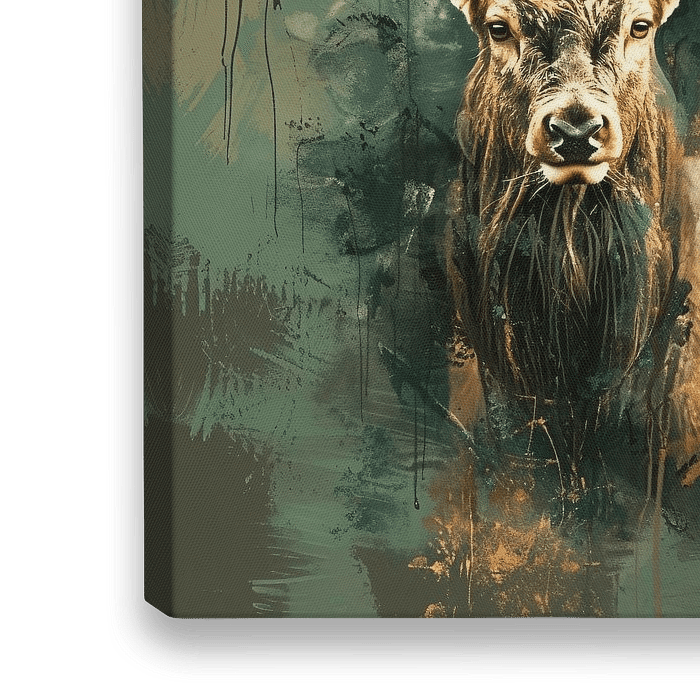 Bestelle dieses abstrakte Wandbild Abstrakte Malerei von Hirschen mit Farben von Art & Soul Creations als Reproduktion auf Leinwand, Alu-Dibond, als Poster, Fototapete oder Acrylglasbild.