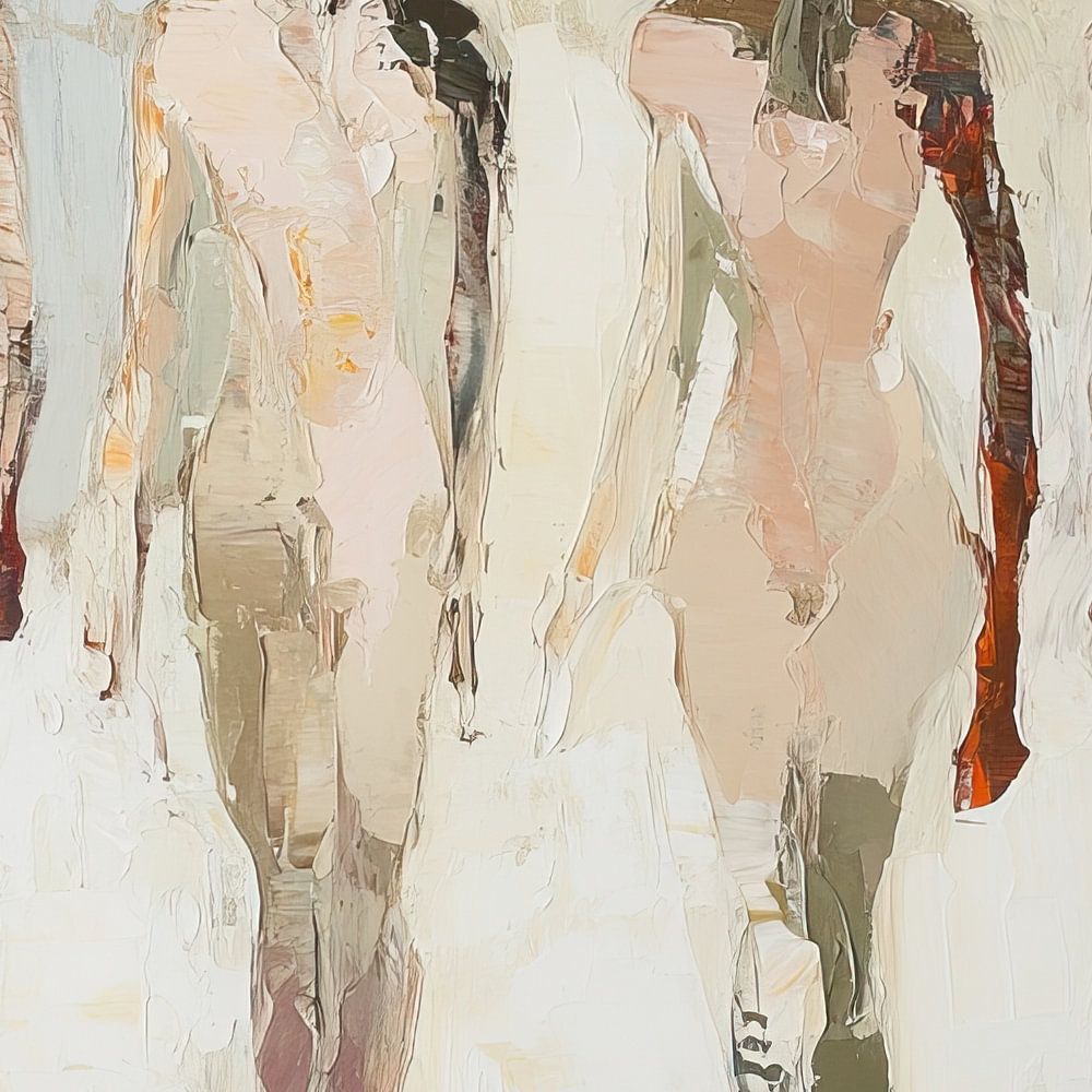 Details: abstrakte Malerei, Frauenmalerei, Figuren, Hauttöne, modern, Kunst, Bewegung, neutrale Farben, Menschen malen, zusammenkommen