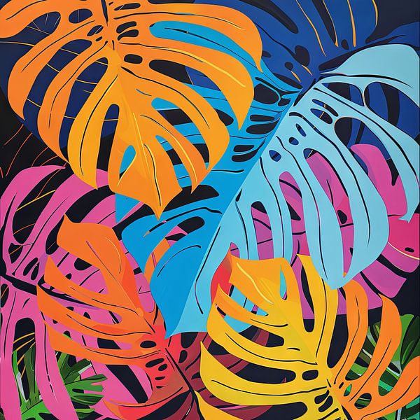 Bestelle dieses moderne Wandbild Abstrakte Monstera - Bunte tropische Kunst von Poster Art Shop als Reproduktion auf Leinwand, Alu-Dibond, als Poster, Fototapete oder Acrylglasbild.