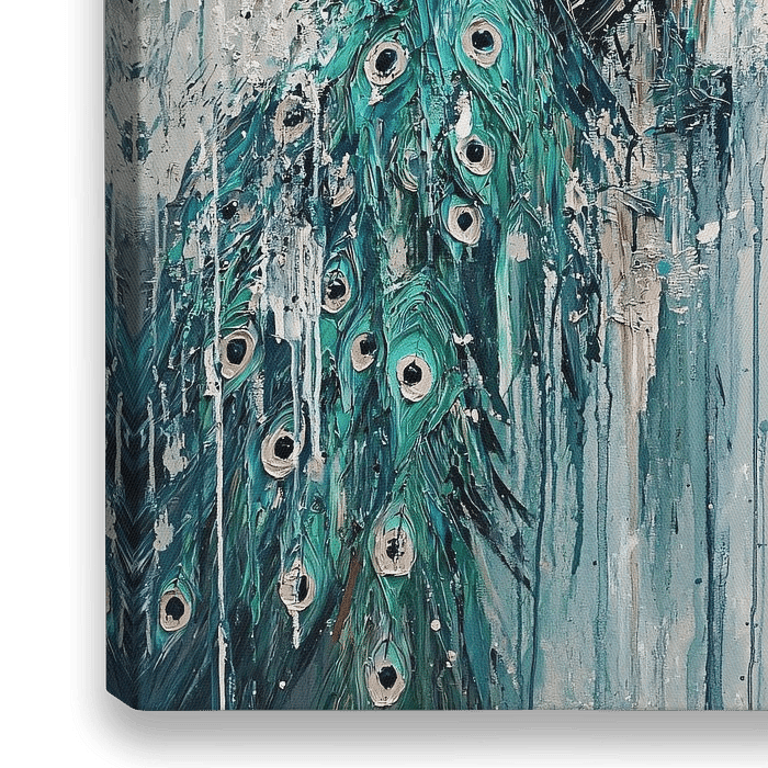 Dieses beeindruckende Kunstwerk zeigt einen Pfau in all seiner Pracht, mit detaillierten Pinselstrichen und einem modernen abstrakten Stil. Die Farben fließen ineinander, wobei kräftige Blau- und Grüntöne die Aufmerksamkeit auf sich ziehen. Das tropfende Farbmuster verleiht dem Gemälde einen dynamischen und ausdrucksstarken Charakter…