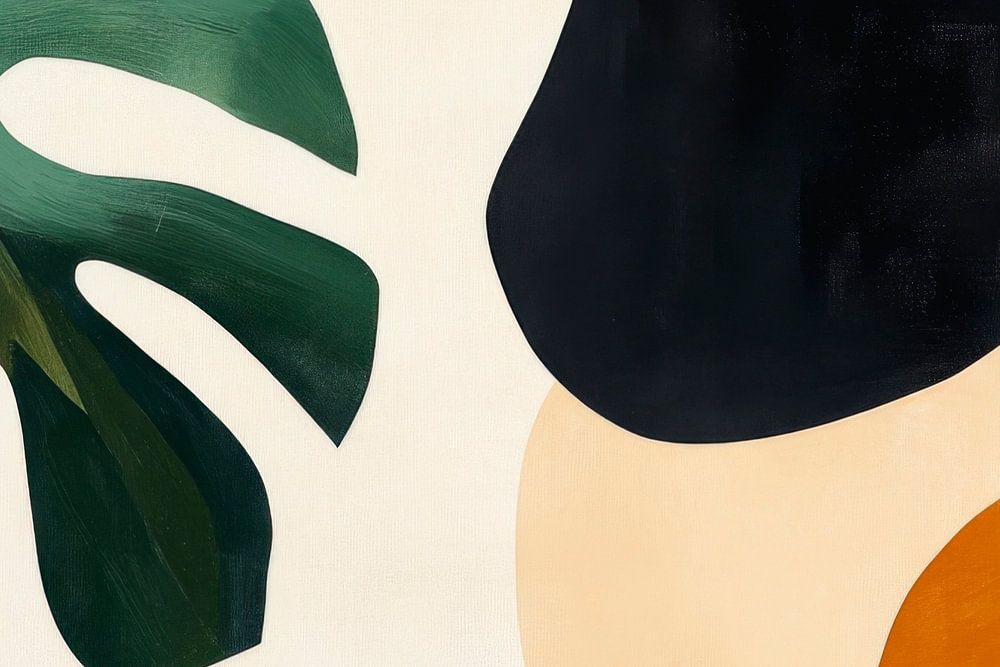 In einem harmonischen Zusammenspiel aus Erdtönen und tiefem Schwarz entfaltet sich das Spiel von organischen Formen und geschwungenen Linien. Die prägnante Monstera-Note bringt einen Hauch von Natur in diese stilvolle Komposition, während die harmonischen Farben eine beruhigende Atmosphäre schaffen. Ein wahrer Blickfang, der die Seele des Raumes einlädt!