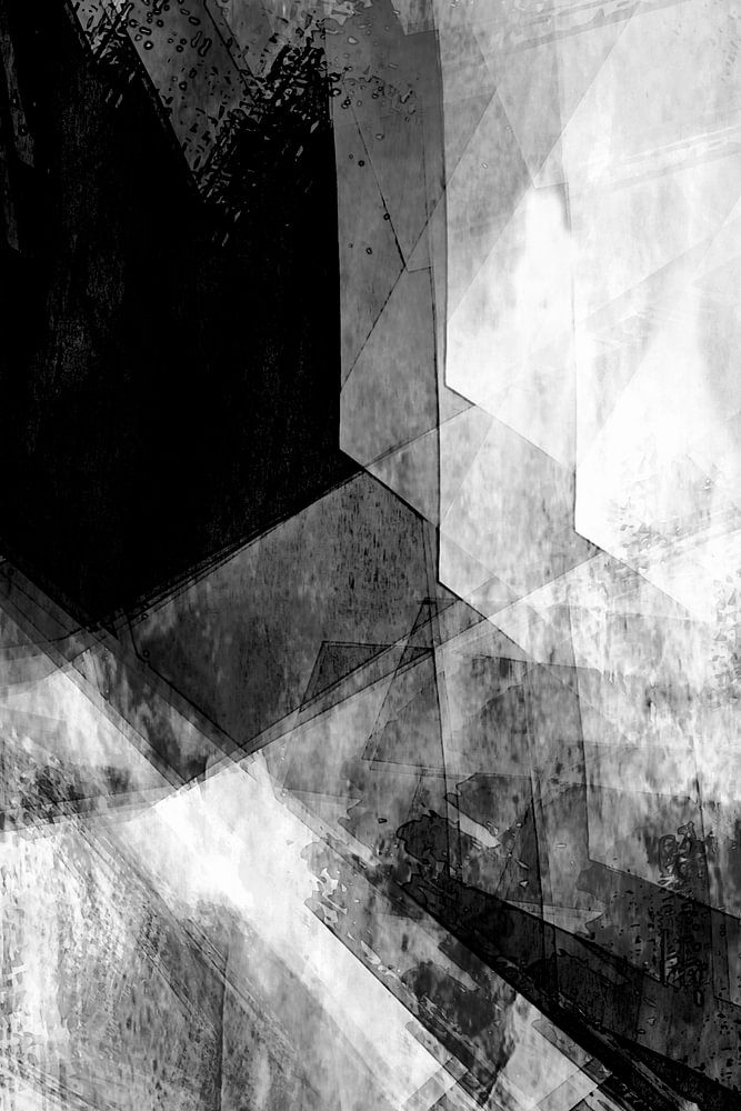 Eine Abstrakte Malerei organisch geometrischen Formen in Grau, Elfenbein, Schwarz und Weiss Farben mit einer Anmutung Skandinavischer Kunst aus dem Norden Europas.