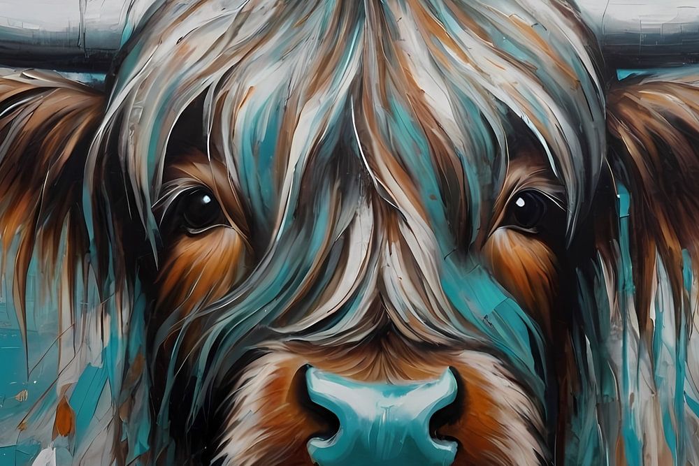 Dieses lebhafte Ölgemälde fängt das Wesen eines majestätischen schottischen Highlanders ein, kunstvoll in Szene gesetzt vor einem abstrakten Hintergrund, der mit Türkis- und Silberschattierungen spielt. Die satten, strukturierten Pinselstriche verleihen dem Porträt eine fast taktile Dimension, während die schimmernden Glanzlichter ihm eine dynamische und moderne Note verleihen. Die Intimität des Blicks des Hochlandbewohners in Kombination mit dem weichen, fließenden Haar schafft ein Kunstwerk, das Emotion und Gelassenheit ausstrahlt. Dieses Gemälde eignet sich perfekt für ein modernes Wohnzimmer und bringt ein Stück Natur auf eine Weise ins Spiel, die sowohl beeindruckend als auch beruhigend ist. Es ist eine raffinierte Wahl für alle, die ihr Zuhause mit einem besonderen Stück aufwerten möchten.