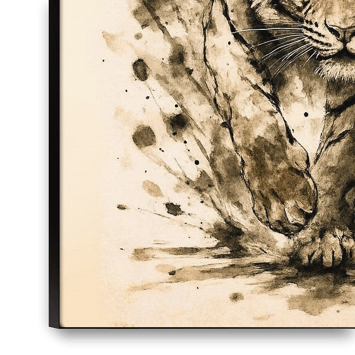 Abstrakte Tuschemalerei eines Tigers in Bewegung, der mit intensivem Blick vorwärts geht. Dynamische Pinselstriche und Tintenspritzer erzeugen einen energiegeladenen und künstlerischen Effekt, der den Realismus der Tigerstreifen mit ausdrucksstarken abstrakten Texturen verbindet. Der Hintergrund ist minimal und hellbeige und betont die…