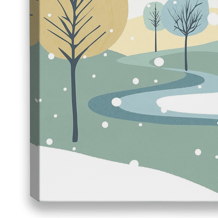 Abstrakte Landschaft mit fünf Bäumen und Feldern im Schnee. Die Farbpalette umfasst neben Weiß gedeckte Grün- und Blautöne sowie Goldgelb, die der Winter-Szene eine friedliche Atmosphäre verleihen.