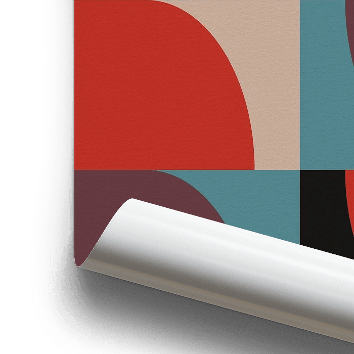Dieses moderne abstrakte Kunstwerk zeigt geometrische Grundformen und klare Linien im Retro-Stil. Knackige Kreise, Blöcke und dynamische Formen sind mit Gleichgewicht und Rhythmus angeordnet und lassen sich vom Bauhaus, der Architektur und dem abstrakten Expressionismus inspirieren. Die Farbpalette umfasst Terrakotta, Weinrot, gedämpftes Weiß, verbranntes Orange, Khakigrün, tiefes Blau, Schwarz und erdiges Braun - und schafft so Wärme und Harmonie in jeder Komposition.