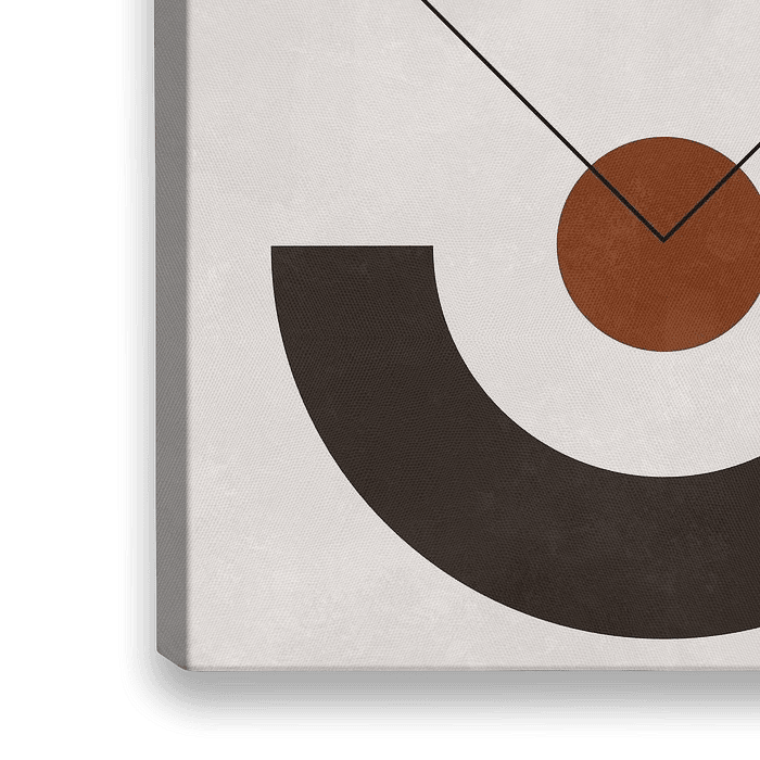 Abstraktes geometrisches Kunstwerk mit Kreisen und Quadraten in den Farben Braun und Terrakotta auf einem taupefarbenen Hintergrund mit subtiler Struktur.