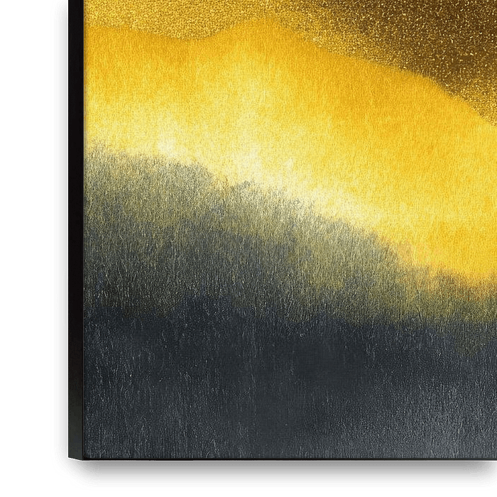 Eine raffinierte und ruhige abstrakte Landschaft mit wellenförmigen Bergsilhouetten in tiefem Schwarz und rauchigem Grau, kontrastiert mit leuchtenden goldenen Schichten. Die Komposition ist minimalistisch und doch auffallend, wobei fließende Aquarellstrukturen für Tiefe und Harmonie sorgen.