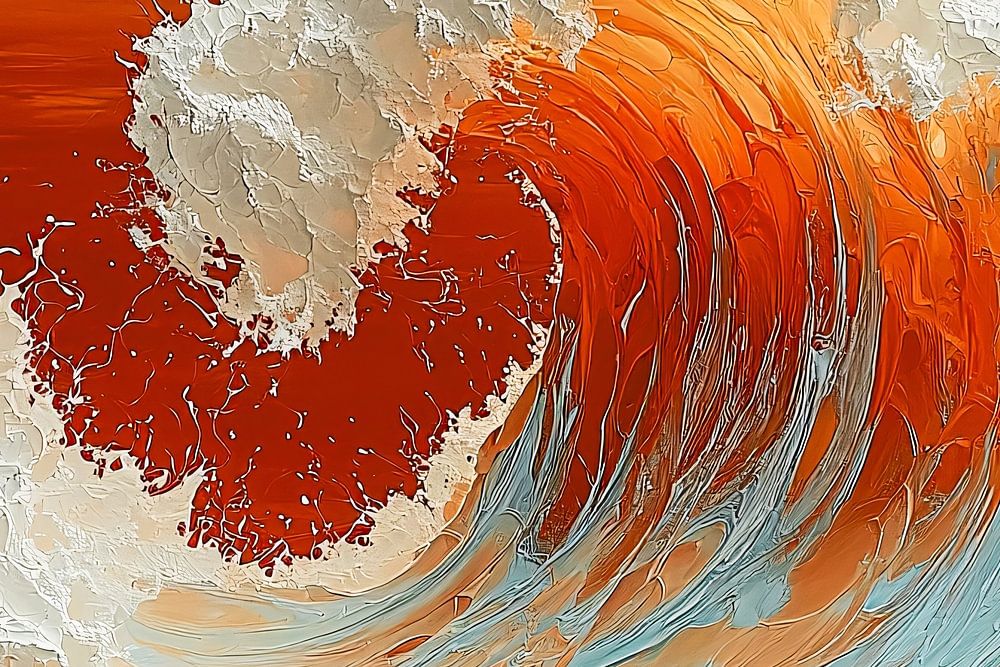Dieses auffällige Design zeigt eine kraftvolle Welle, die in einer satten Farbkombination aus Orange und Weiß zum Leben erwacht. Die Texturen und Details vermitteln ein Gefühl von Bewegung und Energie und machen es zu einer perfekten Wahl für moderne Innenräume, die ein Statement setzen wollen. Die Kombination aus warmem Orange und kühlem Blau schafft einen faszinierenden Kontrast, der die Aufmerksamkeit auf sich zieht und jedem Raum einen Hauch von Dynamik verleiht. Ideal für Wohnräume, Büros oder andere Orte, an denen eine energiegeladene und künstlerische Atmosphäre gewünscht wird.