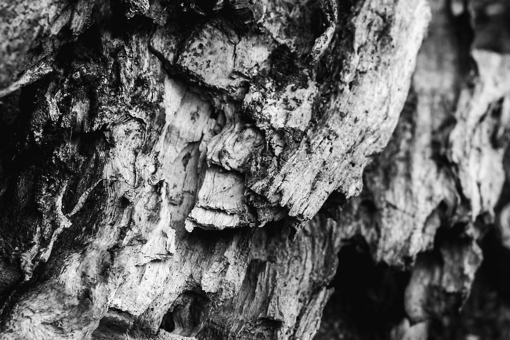 Abstrakte Baumrinde in Schwarz und Weiß. Detailaufnahme eines Stückes eines Baumes.