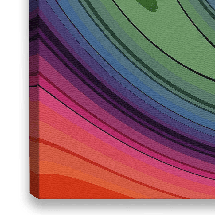 Ein wenig an Pop-Art erinnernd, sind Farbbänder in einem Teil des Regenbogenfarbspektrums - von Orange über Grün und Blau bis hin zu Violett und Schwarz - zu einer teilweise gezeigten Spirale verzwirbelt, was ein dynamisches abstraktes Bild ergibt.