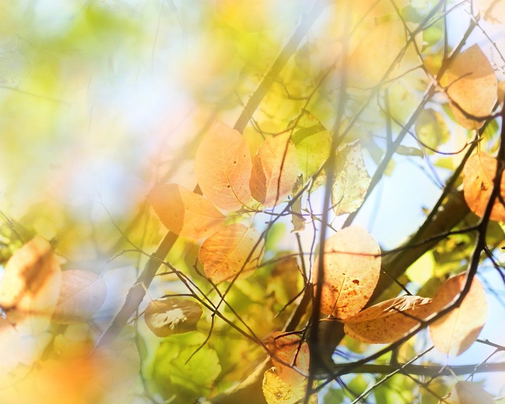 Abstrakter Herbsthintergrund, Blick in einen Baum mit bunten Blättern vor hellem Himmel, Mehrfachbelichtung mit scharfen und unscharfen Teilen, Kopierraum, gewählter Fokus