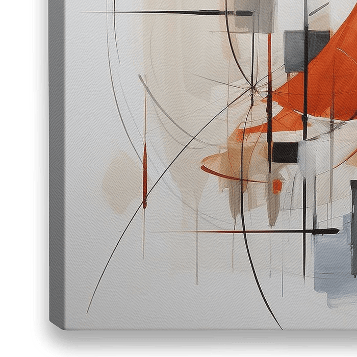 Abstrakter Tanz | Moderne abstrakte Kunst - Dieses dynamische Werk kombiniert schwungvolle Linien und geometrische Formen mit einer kontrastreichen Palette von hauptsächlich orangen, schwarzen und beigen Tönen. Eine eindrucksvolle figurale Form steht im Mittelpunkt, umgeben von abstrakten Elementen, die Bewegung und Tiefe…