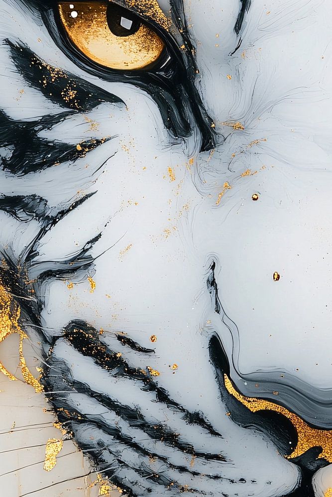 Dieses schöne Kunstwerk stellt einen Tiger in abstrakter Form dar. Die leuchtenden goldenen Akzente verleihen ihm ein einzigartiges Aussehen, das sofort die Aufmerksamkeit auf sich zieht. Die Details in den schwarzen und weißen Linien erzeugen ein kraftvolles und geheimnisvolles Bild des Tieres. Die raffinierten Goldelemente verleihen dem Bild einen Hauch von Luxus und machen es zu einer ausgezeichneten Wahl für moderne Innenräume. Ob im Schlafzimmer, im Wohnzimmer oder im Büro, dieses Kunstwerk ist eine stilvolle und mutige Ergänzung für jeden Raum. Perfekt für alle, die eine Kombination aus minimalistischer Kunst und einem kraftvollen Tiermotiv lieben.