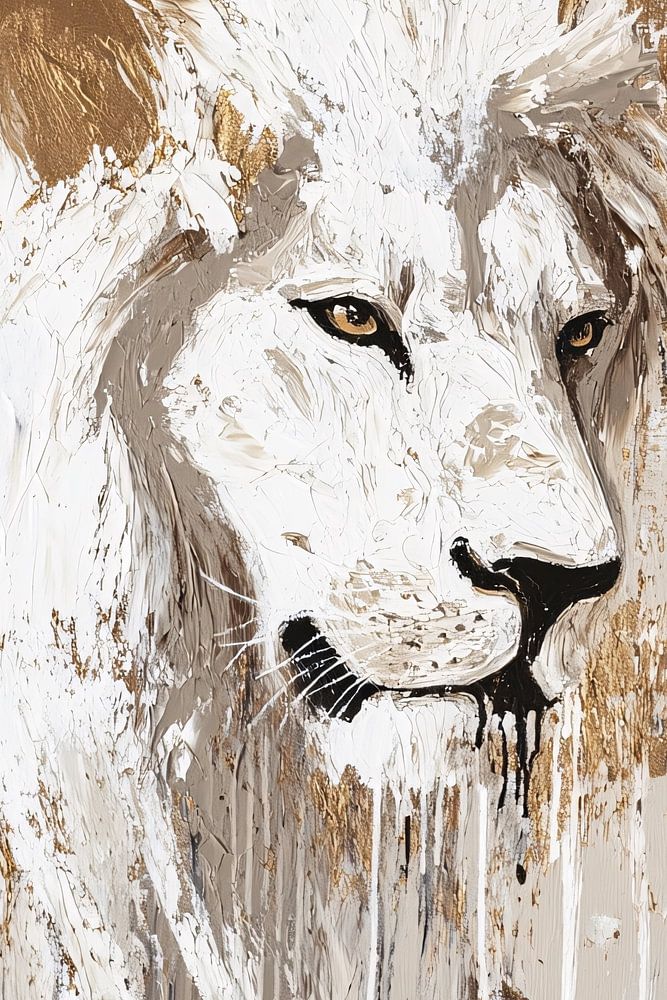 Dieses beeindruckende Gemälde eines Löwen strahlt Kraft und Geheimnis aus, perfekt für Liebhaber abstrakter Kunst. Der Löwe ist in einem einzigartigen Stil mit einem dynamischen Farbschema aus Weiß, Gold und Braun festgehalten. Die Farbe scheint zu tropfen und verleiht dem Gemälde ein lebendiges, fast fließendes Aussehen. Dieses Design vermittelt die majestätische Präsenz des Löwen auf subtile, aber kraftvolle Weise und eignet sich daher ideal als Statement in einem modernen Wohnzimmer oder Büro. Die Verwendung von monochromen Tönen verstärkt den zeitlosen Reiz dieses Kunstwerks.