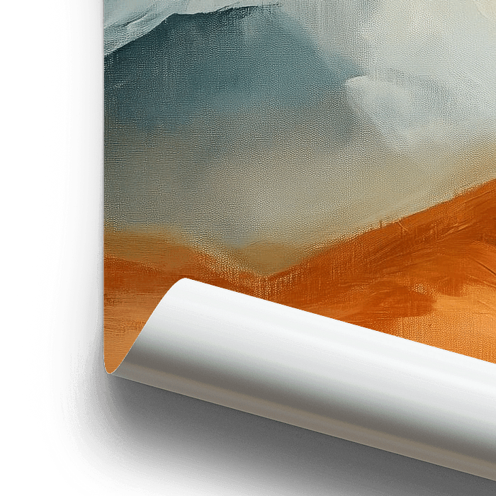 Dieses abstrakte Kunstwerk bietet eine unaufdringliche Darstellung der Berge mit sanften Farben und Formen, die auf subtile Weise die Essenz der Landschaft einfangen. Das Werk spielt mit einem Farbverlauf im Hintergrund, der von warmen, erdigen Tönen zu kühleren Farben übergeht und ein Gefühl von Tiefe und Raum erzeugt. Der große, offene weiße Raum in der Mitte des Kunstwerks dient als Ruhepunkt und verstärkt die heitere und ruhige Atmosphäre.