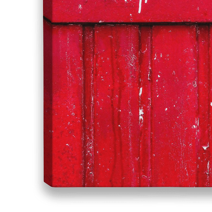 Abstraktes vertikales Linienmuster auf einer hölzernen Türverkleidung mit rostigem Anlaufen in einem Mosaik aus Rot und Weiß. Ein sehr schönes Bild mit einem rustikalen, rustikalen Gefühl. Der verwitterte Charakter fängt die Stimmung von Vintage ein.