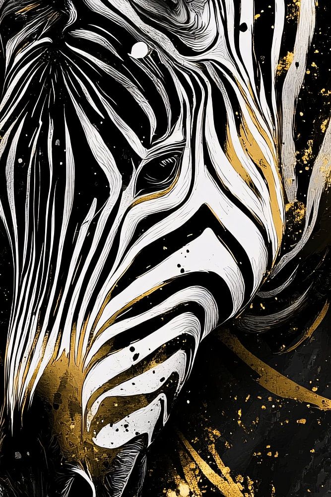 Dieses einzigartige Design zeigt ein majestätisches Zebra in einem auffälligen, monochromen Stil mit atemberaubenden Goldakzenten. Die klaren schwarzen und weißen Linien des Zebras bilden einen brillanten Kontrast zu den dynamischen Goldspritzern, die sich um das Bild herum entfalten. Das Design strahlt sowohl Eleganz als auch Stärke aus und passt perfekt in moderne Interieurs, insbesondere in Räume, in denen ein Hauch von Luxus und Wildheit gewünscht ist. Egal, ob es in einem Schlafzimmer, Büro oder Wohnzimmer hängt, dieses Kunstwerk zieht sofort die Aufmerksamkeit auf sich und fügt ein künstlerisches Element hinzu, das perfekt zwischen Natur und Abstraktion balanciert. Die Verwendung digitaler Techniken sorgt für ein scharfes und detailliertes Bild, das jeder Kunstliebhaber zu schätzen weiß.