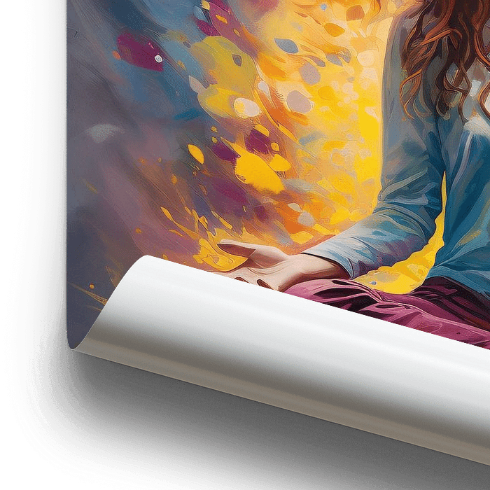 Dieses Leinwandkunstwerk zelebriert den Frieden und die Harmonie der Meditation. Die farbenfrohen und wellenförmigen Bewegungen fangen die innere Ruhe einer meditierenden Frau ein. Die dicke Impasto-Malerei verleiht dem Bild Tiefe und Textur, ideal für einen Kunstrahmen oder eine Leinwand mit Backrahmen.