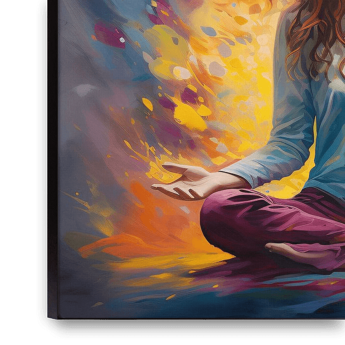 Dieses Leinwandkunstwerk zelebriert den Frieden und die Harmonie der Meditation. Die farbenfrohen und wellenförmigen Bewegungen fangen die innere Ruhe einer meditierenden Frau ein. Die dicke Impasto-Malerei verleiht dem Bild Tiefe und Textur, ideal für einen Kunstrahmen oder eine Leinwand mit Backrahmen.