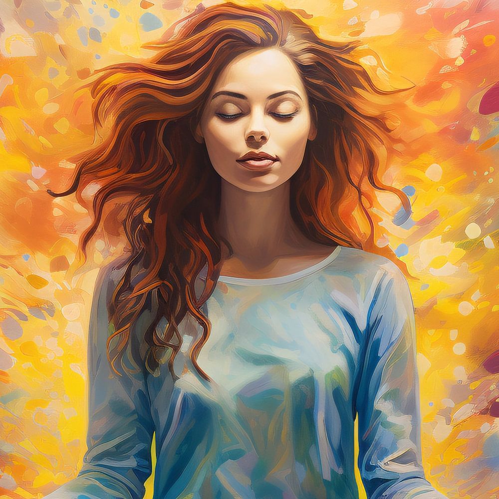 Dieses Leinwandkunstwerk zelebriert den Frieden und die Harmonie der Meditation. Die farbenfrohen und wellenförmigen Bewegungen fangen die innere Ruhe einer meditierenden Frau ein. Die dicke Impasto-Malerei verleiht dem Bild Tiefe und Textur, ideal für einen Kunstrahmen oder eine Leinwand mit Backrahmen.