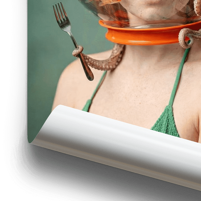 Ein hyperrealistisches, surreales Porträt einer rothaarigen Frau mit Sommersprossen, gekleidet in ein grünes Bikinioberteil und eine orangefarbene Brille mit tealfarbenen Gläsern. Über ihrem Kopf trägt sie eine transparente Glaskugel, die mit Wasser und kleinen Fischen gefüllt ist und in der Licht und Bewegung subtil verzerrt sind. An…