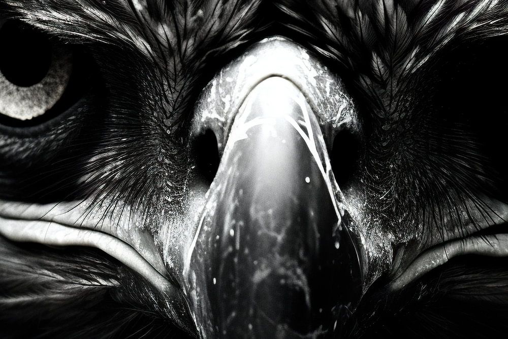 Eagle | Monochrome Eagle - Dieses kraftvolle Bild eines Adlers in Nahaufnahme, das in Schwarz-Weiß wiedergegeben ist, zeigt intensive Blicke und detaillierte Farbstrukturen, die mit subtilen Wassertropfen verziert sind, die eine zusätzliche Dimension der Lebendigkeit hinzufügen. Die Schwarz- und Weißtöne erzeugen einen dramatischen, fast monochromen Look, der es zu einem universell einsetzbaren Werk für eine Vielzahl von Einrichtungsstilen macht.