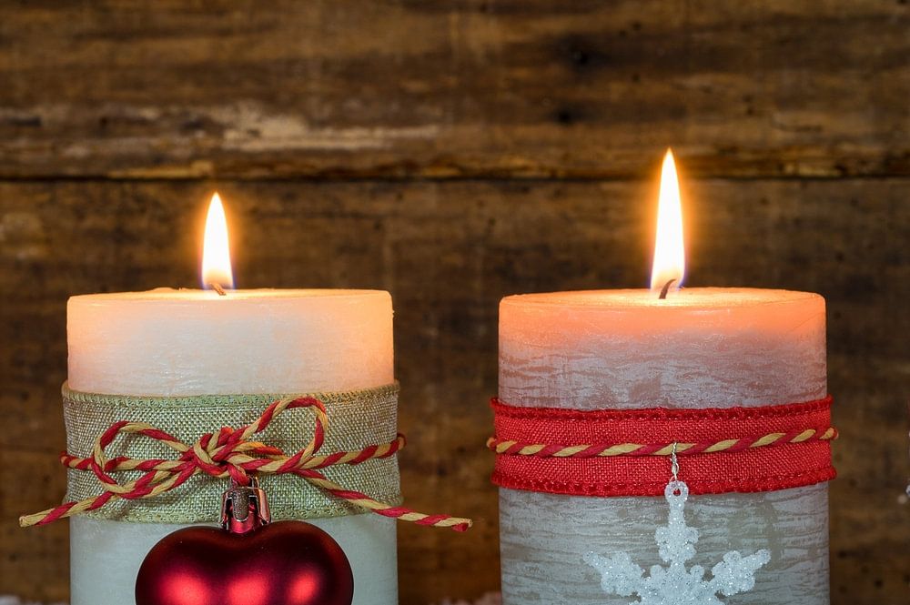 Advent und Weihnachten brennende Kerzen mit Dekoration auf Schnee und hölzernen Hintergrund, Weihnachtskarte, Weihnachtsschmuck, Weihnachtsdekoration, Grußkarte