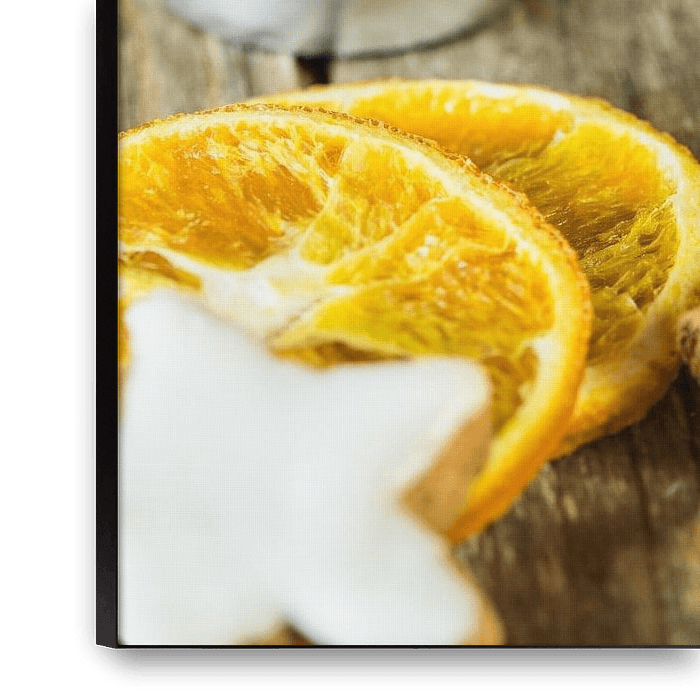 Komposition für die Advents- und Weihnachtszeit mit Kerzenflammen, Orangenscheiben, Zimt und Plätzchen in Sternform