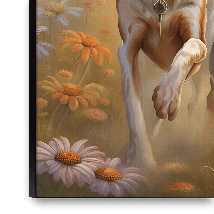 Bestelle das digitale Kunst Bild Afaird Hund spielt in einem Blumenfeld von Johannas Art Creations als Reproduktion auf Leinwand, Alu-Dibond, als Poster, Fototapete oder Acrylglasbild.
