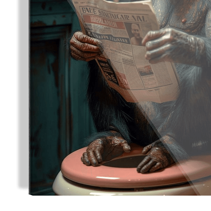 Ein nachdenklicher Affe sitzt auf einer Toilette und liest entspannt eine Zeitung. Perfekt für humorvolle Badezimmer-Poster.