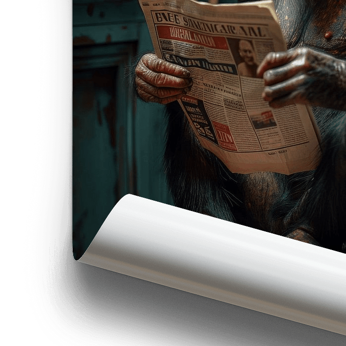 Ein nachdenklicher Affe sitzt auf einer Toilette und liest entspannt eine Zeitung. Perfekt für humorvolle Badezimmer-Poster.