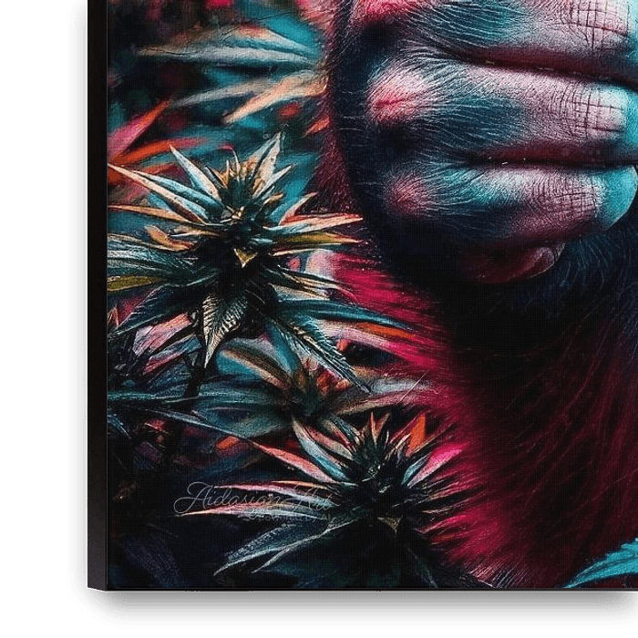 Hier sitzt er – mitten im Cannabisfeld, das beschlossen hat, sich selbst zur Partyzone zu machen: Pink, Lila und Grün explodieren wie Konfetti auf einer Farb-Achterbahn. Keine Ahnung, wer das Feld bestellt hat, aber offensichtlich ist die gute Laune im Überfluss gewachsen. Es ist ein wildes, fröhliches Durcheinander, das schreit: „Hier…