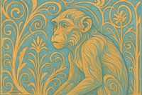 Ein stilisierter Affe sitzt ruhig zwischen anmutigen Pflanzenranken, die mit fließenden Linien und reichen Ornamenten ausgearbeitet sind. Der sanfte Kontrast zwischen Goldtönen und türkisfarbenem Hintergrund verleiht ihm Tiefe, während die geschwungenen Formen den Blick auf das ruhige Tier lenken. Geometrische Schnörkel wechseln sich…