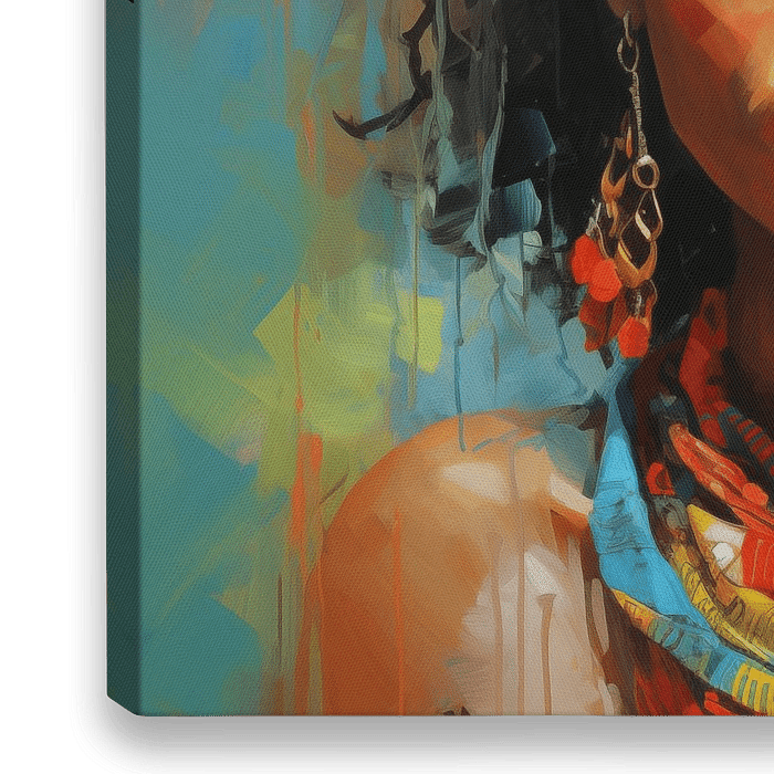 Afrikanische Frau, gemalt, bunt in rot, orange, blau, gelb.