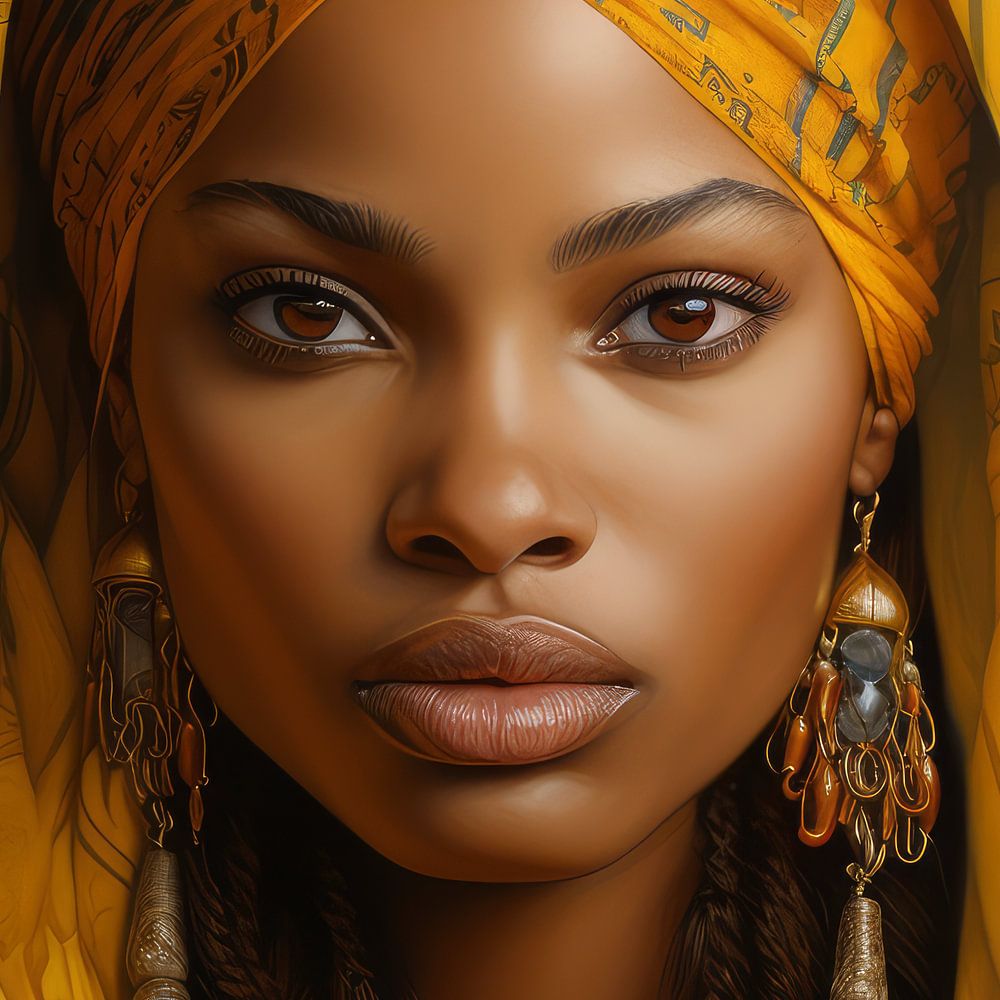 Schöne Frau mit Kopftuch. Goldschmuck bedeckt sie. Sie sieht aus wie eine afrikanische Königin und hat auch ein bisschen was Ägyptisches an sich.