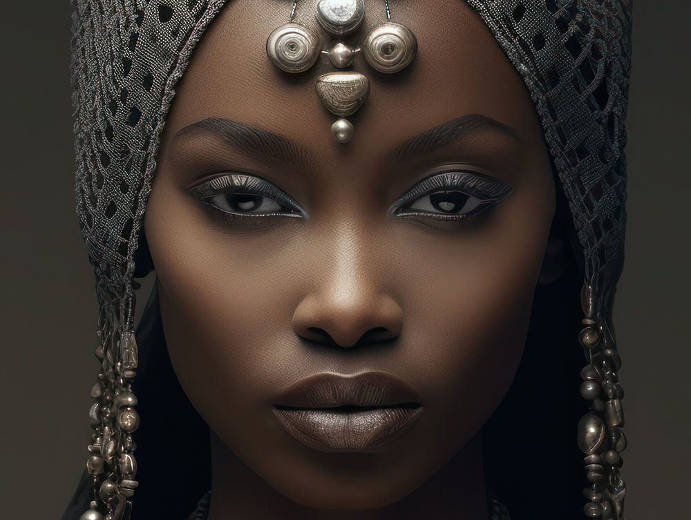 Schöne afrikanische Frau mit Kopftuch. Goldschmuck bedeckt sie. Sie sieht aus wie eine afrikanische Königin und hat auch ein bisschen was Ägyptisches an sich.