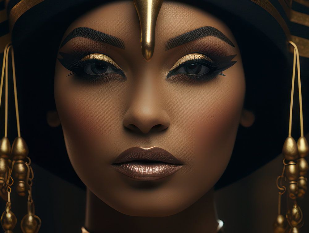 Schöne afrikanische Frau mit Kopftuch. Goldschmuck bedeckt sie. Sie sieht aus wie eine afrikanische Königin und hat auch ein bisschen was Ägyptisches an sich.
