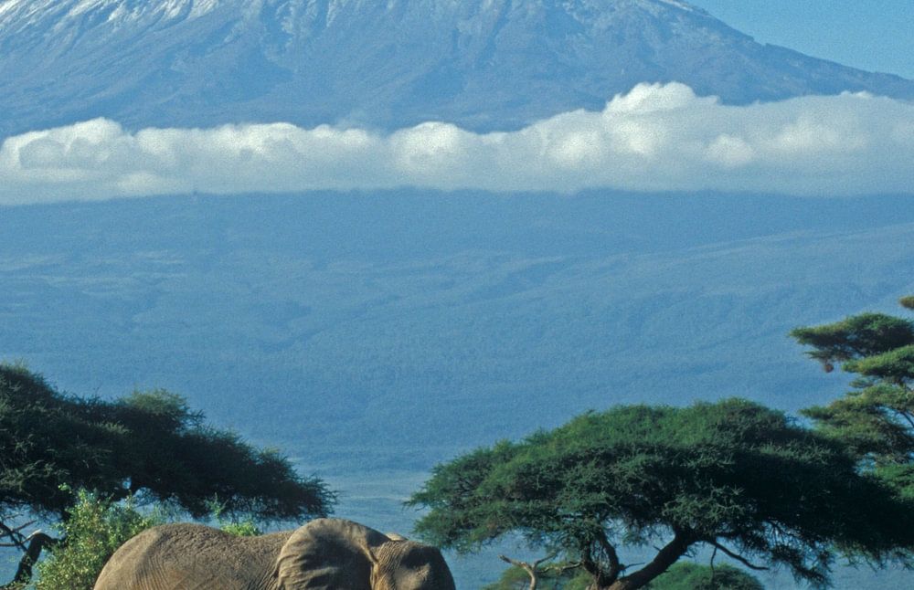 Eine Herde afrikanischer Elefanten am Fuße des Kilimandscharo in Kenia.