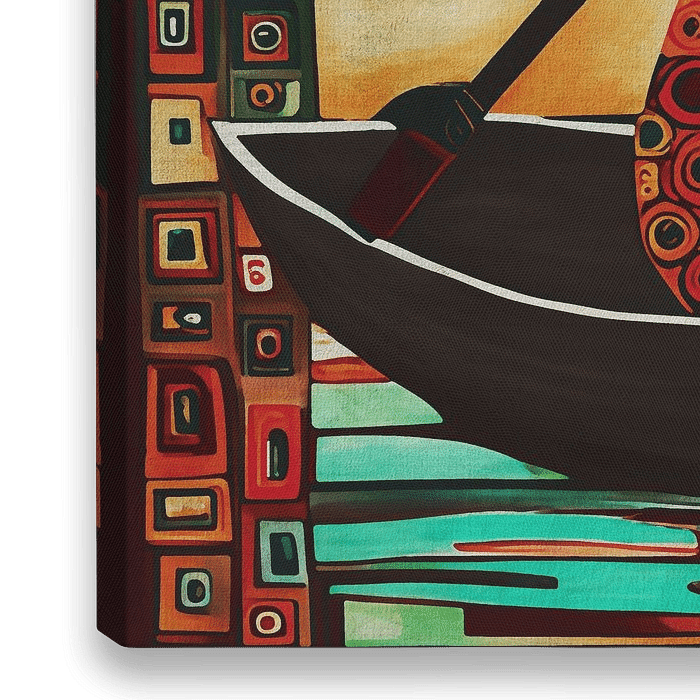 Bestelle dieses abstrakte Wandbild Afrikanisches Mädchen in traditioneller Kleidung in einem kleinen Boot von Jan Keteleer als Reproduktion auf Leinwand, Alu-Dibond, als Poster, Fototapete oder Acrylglasbild.
