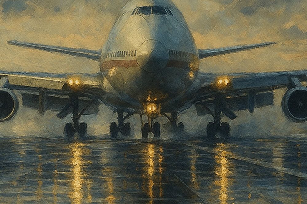 Ein beeindruckendes Gemälde einer Boeing 747, die kurz nach einem Regenschauer auf einer schimmernden Landebahn landet. Die Reflexionen der Landescheinwerfer tanzen auf dem nassen Rollfeld, während sich der bedrohlich bewölkte Himmel langsam der Abendsonne öffnet. Dieses Werk fängt den mächtigen Moment ein, in dem Mensch und Maschine den Elementen trotzen - eine Hommage an den majestätischen Jumbojet und die Poesie der Luftfahrt.