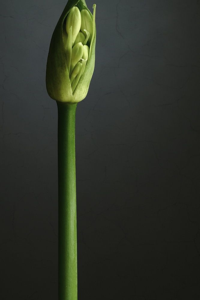 Eines meiner Meisterwerke! Wenn ich das selbst sagen darf. Dies ist die Knospe eines Agapanthus, die sich langsam öffnet. Sehr subtil mit natürlichem Licht inszeniert. In der Nachbearbeitung habe ich dem Hintergrund einen minimalen Crackle-Effekt hinzugefügt.