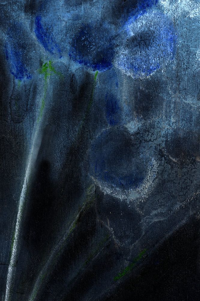 Das Werk ist überwiegend dunkel, wobei die Hauptfarbe verschiedene Blautöne sind, die für Tiefe und Kontrast sorgen. Das Weiß bildet einen hellen Punkt in der Szene und unterstreicht den dunklen Hintergrund.
