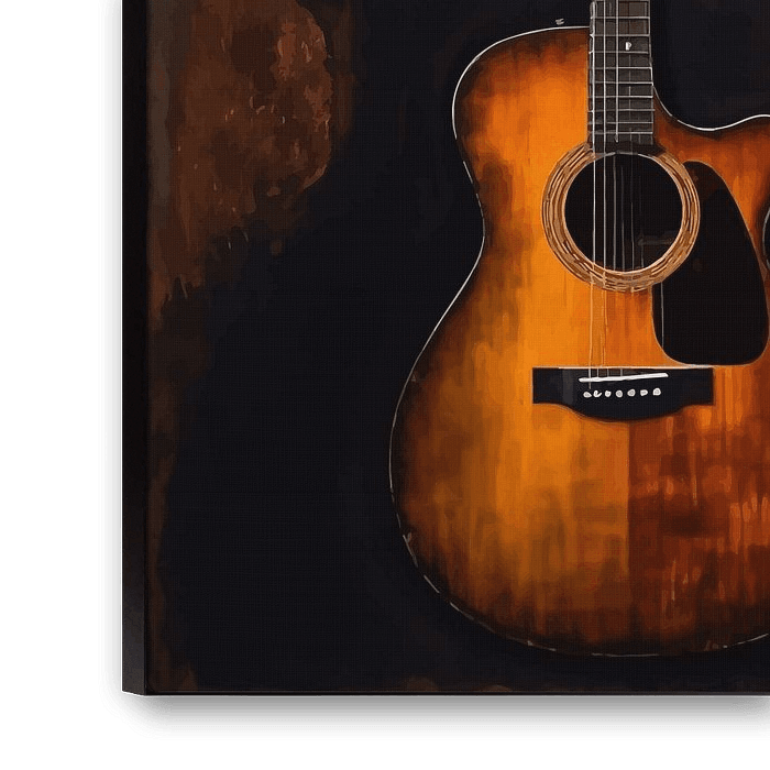 Dieses chiaroscurofarbene, malerische Werk fängt die Akustikgitarre mit dramatischer Intensität ein und hebt ihre Form hervor, während Licht und Schatten über ihre Kurven tanzen. Gesprenkelte Texturen brechen wie Schallwellen nach außen und evozieren die rohe Energie der angeschlagenen Akkorde, die die Luft erfüllen. Die Gitarre wird zu mehr als nur einem Instrument - sie wird als Träger von Rhythmus und Erinnerung dargestellt, ihre Präsenz ist kühn und doch zeitlos. Perfekt für Sammler, die Kunst suchen, die die Seele der Musik durch ausdrucksstarke Kontraste und fließende Bewegung feiert.