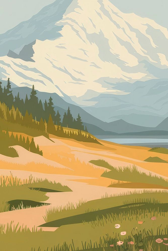 Ein traumhaftes Landschaftsgemälde erweckt die majestätische Schönheit Alaskas zum Leben, mit sanften Hügeln, schneebedeckten Bergen und einem ruhigen Fluss, der durch die satte Natur fließt. Diese idyllische Szenerie verströmt Ruhe und Abenteuerlust und eignet sich perfekt für das Wohnzimmer, um eine Atmosphäre der Entspannung und Erkundung zu schaffen.