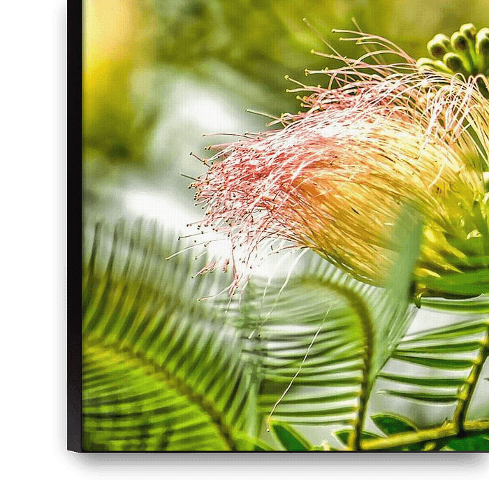 Eine Nahaufnahme der bunten flauschigen Blüten des Albizia julibrissin oder des persischen Seidenbaums führt zu einem fast abstrakten Spiel von Farben, Linien und Oberflächen.