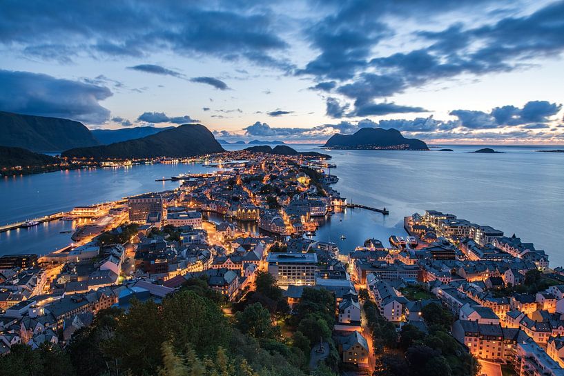 Eine schöne Aufnahme der Stadt Alesund mit ihren vielen Inseln an der Westküste Norwegens. Das Bild wurde Anfang September 2019 kurz nach Sonnenuntergang aufgenommen und zeigt die schöne norwegische Stadt mit ihren vielen Inseln.